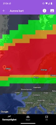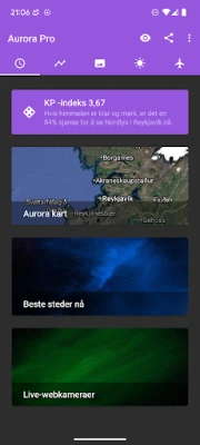 Dyk dybere ned i universets vidundere med avancerede prognoser. Denne app leverer detaljerede forudsigelser for den kommende time, de næste par timer og endda flere uger frem, hvilket giver dig mulighed for at planlægge din nordlysoplevelse i god tid – selvfølgelig med vejret i mente. Udforsk et dynamisk kort, der viser auroraens intensitet globalt, baseret på pålidelige SWPC-prognoser, og find de bedste observationssteder i din nærhed. Modtag gratis push-notifikationer, når geomagnetisk aktivitet forventes at være høj, så du altid er et skridt foran. For de videnskabeligt interesserede tilbyder appen også solvindsstatistikker og fascinerende solbilleder, der beriger din forståelse af fænomenet.